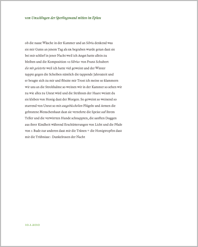 In 2001 publiceerde Friederike Mayröcker een expliciet Requiem für Ernst Jandl, in 2005 Und ich schüttelte einen Liebling, tot in 2012 de bundel Von den Umarmungen verscheen. Het is een zinnelijke bundel, waarin omhelsd, omarmd, gekust wordt. Gedichten waarin steeds andere werkelijkheden opflitsen, waar rouw (om wie of wat dan ook) wordt gesmoord in aanrakingen, warme poriën, herinneringen aan huid. Steeds zie je beelden van een vrouw, een meisje van acht jaar in een blauw plooirokje, een meisje van drie, een tiener met de eerste ongesteldheden als er in een kuip met water maandverbanden in de week staan. Er wordt een uiterst sensibele wereld van muziek en poëzie opgeroepen die voortkomt uit kijken en luisteren, uit het verwerken van bijzondere taal, die van de herinnerde liefde, die van de geliefde, die van de afwezige geliefde – en dan steeds tegen de achtergrond van wat Thomas Kling haar hoofdthema noemde: het gevecht tegen de ‘definitieve writer’s block – de dood’. Die achtergrond – de mussenwand, rozenstruiken, Schuberts 'o Silvia' – is het tafereel voor verstreken tijd, voor wat er rest na iemands heengaan. ‘Ik ben nu jouw klimop,’ laat Robert aan Clara Schumann weten als de afstand tussen hen onoverbrugbaar geworden is – de mussenwand is het houvast voor de lichamelijke aanwezigheid van de geliefde, ook al is die gestorven.
